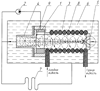 Недостатком устройства является наличие в нем значительного количества непрямолинейных каналов, проходя через которые жидкость теряет скорость и кинетическую энергию, являющуюся основным поставщиком тепловой энергии. В этом случае интенсификация процесса кавитации в потоке жидкости уже не является определяющим фактором для получения избыточной тепловой энергии. Уменьшение скорости жидкости, протекающей через устройство, также является нежелательным, так как в этом случае замедляется оборот ее в замкнутом цикле через нагрузку (потребителя тепловой энергии) и насос. Известна другая статическая многоконтурная термогенерирующая установка (см. патент RU № 2190162 С1, МПК 7 F24D 3/02 от 03.05.2001 г.), содержащая циклон с входным и выходным отверстиями, корпус (трубу), стенка которой образована витками из трубки, навитой плотно в виде пружины растяжения с жестким соединением соседних витков между собой с входным и выходным патрубками на опорных (конечных) витках, тормозной элемент, бак (обойму) с жидкой средой, в которую погружен термогенератор. Выходное отверстие циклона, направленное вовнутрь полого корпуса (трубы) тангенциально и наклонно, соответствует углу наклона витков трубки, образующих стенку корпуса (трубы).