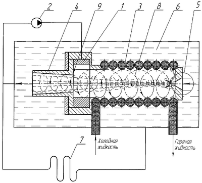 На границе взаимодействия основного и вспомогательного потоков (осевого и приосевого) (граница согласно схематическому чертежу имеет поверхность усеченного конуса), имеющих различную скорость с различными по величине градиентами давления, возникает образование и дальнейшее схлопывание кавитационных пузырьков, кинетическая энергия переходит в тепловую, что приводит к интенсивному нагреву жидкости. Наличие кольцевого тормозного элемента 9 на выходном сопле 4, соотношение его геометрических размеров позволяют стабилизировать рабочий процесс и компенсировать потерю скорости выходящего потока жидкости. Нагретая жидкость из бака 6 поступает потребителю на нагрузку 7, откуда по всасывающей линии после потери части тепловой энергии насосом 2 возвращается в циклон 1. Подогрев различных жидкостей с использованием навитой трубки, образующей стенку камеры корпуса 3, осуществляют путем подачи в полость трубки через ее входной патрубок жидкости. Проходя через нагретую стенку по навитой трубке, жидкость в результате интенсивного теплообмена нагревается и через выходной патрубок поступает потребителю.