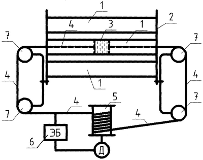 Устройство для очистки внутренних стенок труб 1 кожухотрубного теплообменника 2 состоит из шарошки 3, с двух сторон к которой прикреплены тросы 4. Тросы 4 соединены с реверсивной лебедкой 5, а лебедка 5 – с электронным блоком 6. Тросы 4 пропущены через направляющие блоки 7.