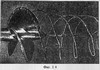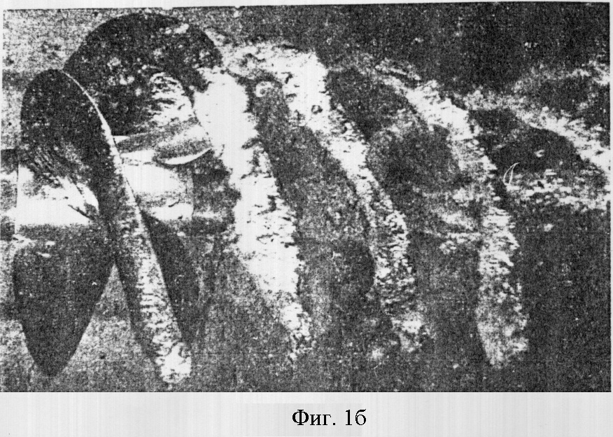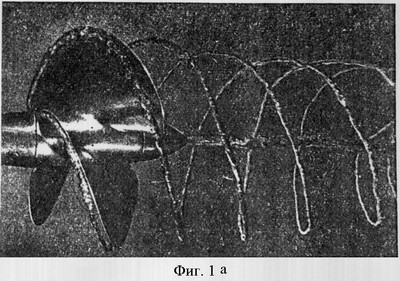 Фото гребного винта (фиг.1), заимствованное из (3), хорошо показывает закрутку воды за винтом, образование жгутов силовых линий (трубок тока), сходящих с концевых кромок лопастей, и их образование на засасывающей стороне. Силовая линия является замкнутой спиралью переменного шага и радиуса. Совокупность множества силовых линий образует силовое поле винта. Вдоль этих линий происходит движение масс воздуха (воды). Структура поля хорошо видна у гребного винта благодаря кавитационным пузырькам. Особенности этой структуры будут использованы и для описания поля воздушного винта. Отличия обуславливаются тем, что плотность воздуха на три порядка меньше плотности воды, ось вращения винта вертолета вертикальна и носитель расположен под винтом, в области повышенного давления.