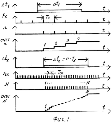 Запрет счета импульсов начинается на первом такте Т1 тактируемой последовательности операций, который формируется после фронта импульса второй последовательности и окончания действующего во время этого фронта импульса частоты F0 или окончания возникшего после этого же фронта импульса частоты F0 на фронте очередного импульса частоты F0. Такая последовательность операций позволяет разделить во времени процессы счета n импульсов частоты Fx и запрета этого счета.