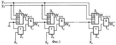 Работа предлагаемого логического вычислителя осуществляется следующим образом. На его первый, …, n-й информационные и первый, второй управляющие входы подаются соответственно двоичные сигналы x1, …, xn {0, 1} и импульсные сигналы у1, у2 {0, 1} (фиг.2), причем период T сигнала у2 должен удовлетворять условию Т> t, где t= tTp+ tИ+(n-1)( tИЛИ+ tИ), а tИ, tИЛИ и tТр есть длительности задержек, вносимых элементами 1i, 2i и D-триггером 3i соответственно. Тогда сигнал на выходе элемента 1i будет определяться рекуррентным выражением