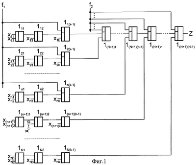 К причине, препятствующей достижению указанного ниже технического результата при использовании прототипа, относится низкое быстродействие, обусловленное тем, что максимальное время задержки распространения сигнала в прототипе определяется выражением =( К+ Э+ Кл)(k-1)+( К+ Э+ Кл)(N-1), где К, Э и Кл есть длительности задержек, вносимых соответственно компаратором, булевым элементом ИСКЛЮЧАЮЩЕЕ ИЛИ и замыкающим (размыкающим) ключом, содержащимися в каждом реляторе; k=0,5(n+1); .