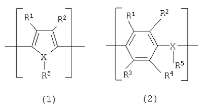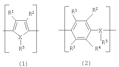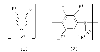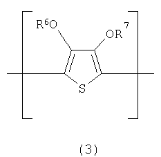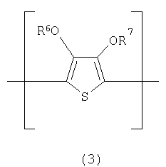 в которых радикалы от R1 до R4 каждый независимо представляют собой моновалентную группу, выбранную из группы, состоящей из атома водорода, линейной или разветвленной, насыщенной или ненасыщенной алкильной, алкокси или алкилзамещенной группы сложного эфира, содержащей от 1 до 10 атомов углерода, атома галогена, нитрогруппы, цианогруппы, первичной, вторичной или третичной аминогруппы, группы CF3, фенильной группы или замещенной фенильной группы; каждая из пар радикалов R1 и R2, R3 и R4 может сочетаться произвольным образом с образованием бивалентной цепи для получения по меньшей мере одной 3-, 4-, 5-, 6- или 7-членной насыщенной или ненасыщенной циклической углеводородной структуры вместе с атомами углерода, замещенными радикалами R1 и R2 или радикалами R3 и R4; объединенная циклическая цепь может содержать связь с карбонилом, простой эфирной группой, сложноэфирной группой, амидной группой, сульфидной группой, сульфинилом, сульфонилом или имино в произвольном положении; Х представляет собой атом кислорода, атом серы, или атом азота; R5 присутствует только в том случае, когда Х представляет собой атом азота, и независимо представляет собой атом водорода или линейную или разветвленную, насыщенную или ненасыщенную алкильную группу, содержащую от 1 до 10 атомов углерода. В соответствии с настоящим изобретением в формуле (1) или (2) радикалы от R1 до R4 каждый независимо предпочтительно представляют атом водорода или линейную или разветвленную, насыщенную или ненасыщенную алкильную или алкоксигруппу, содержащую от 1 до 6 атомов углерода, и каждая из пар радикалов R1 и R2, R3 и R4 может сочетаться с образованием кольца. В соответствии с настоящим изобретением электропроводящий полимер, содержащий повторяющееся звено, представленное формулой (1), предпочтительно представляет собой электропроводящий полимер, повторяющееся звено которого представлено следующей формулой (3):
