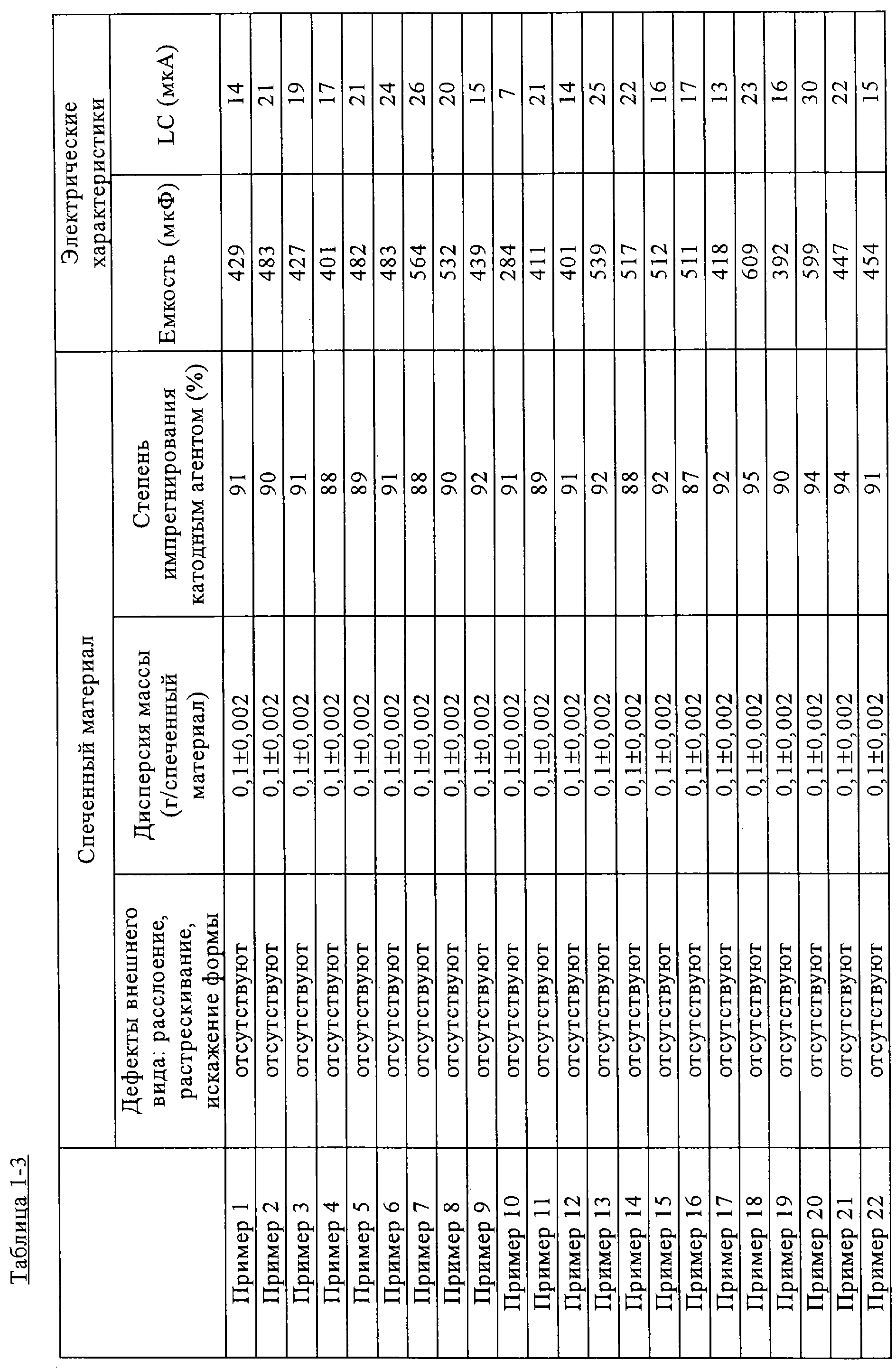 в которой радикалы R6 и R7 каждый независимо представляет атом водорода, линейную или разветвленную, насыщенную или ненасыщенную алкильную группу, содержащую от 1 до 6 атомов углерода, или заместитель, позволяющий образовать по меньшей мере одну 5-, 6- или 7-членную насыщенную циклическую углеводородную структуру, содержащую два кислородных фрагмента, получаемую из алкильных групп, которые сочетаются друг с другом в произвольном положении; циклическая структура включает структуру, содержащую виниленовую связь, которая может быть замещенной, и фениленовую структуру, которая может быть замещенной. В электропроводящий полимер, имеющий указанную химическую структуру, вводят допант, в качестве допанта могут быть использованы известные допанты, без ограничений. Конкретные примеры неорганического полупроводника представляют, в основном, неорганический полупроводник, включающий диоксид свинца или диоксид марганца, и неорганический полупроводник, включающий тетраоксид трижелеза. Указанные полупроводники могут быть использованы по отдельности или при сочетании двух из них или более. Примеры полимера, содержащего повторяющееся звено, которое представлено формулой (1) или (2), включают полианилин, полиоксифенилен, полифениленсульфид, политиофен, полифуран, полипиррол, полиметилпиррол и их замещенные производные и сополимеры. Среди указанных веществ предпочтительными являются полипиррол, политиофен и их замещенные производные (например, поли(3,4-этилендиокситиофен)). В том случае, когда используемые органические или неорганические полупроводники имеют электропроводность от 10-2 См/см до 103См/см, изготовленный конденсатор имеет меньший импеданс, и его емкость при высоких частотах может быть увеличена. Слой электропроводящего полимера формируют, например, методом полимеризации способного полимеризоваться соединения, такого как анилин, тиофен, фуран, пиррол, метилпиррол или их замещенные производные, при воздействии окисляющего агента, способного удовлетворительно подвергаться реакции окисления – дегидрирующему двухэлектронному окислению. Примеры осуществления реакции полимеризации способного полимеризоваться соединения (мономера) включают полимеризацию в парообразном состоянии и полимеризацию в растворе. Слой электропроводящего полимера формируют на поверхности спеченного материала из монооксида ниобия, на которой имеется диэлектрический материал. В том случае, когда электропроводящий полимер представляет собой растворимый в органическом растворителе полимер, пригодный для нанесения покрытия из раствора, для того чтобы сформировать слой электропроводящего полимера, используют способ получения полимерного покрытия на поверхности спеченного материала. Одним из предпочтительных примеров способа изготовления с использованием полимеризации в растворе является способ погружения спеченного материала – монооксида ниобия, на котором имеется слой диэлектрического материала, в раствор, содержащий окисляющий агент (раствор 1), и последующего погружения спеченного материала в раствор, содержащий мономер и допант (раствор 2), при осуществлении при этом полимеризации, для того чтобы сформировать слой электропроводящего полимера на поверхности спеченного материала. Также спеченный материал может быть погружен 