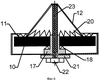 Контактные электроды могут иметь несколько вариантов исполнения. Так, на фиг.1 и 2 показана конструкция контактных электродов в виде сдвоенных проволочных держателей, обеспечивающих жестко фиксированное положение поджигателя. На фиг.6 показан узел поджига с конусным контактным электродом 12, у которого контактная часть выполнена из периодической системы зубьев 20, образующих систему контактов с поверхностью дискового поджигателя 10. Такая же зубчатая система контактов использована на контактном электроде 11. Оба контактных электрода 11 и 12 притянуты через керамическую шайбу 21 гайкой 22 к поджигателю через шпильку 23 и пружину 18. С целью уменьшения габаритов узла поджига электрод 11 может иметь упрощенную конструкцию – выполнен в виде плоской шайбы, прижатой через керамику 17 к противоположной электроду 12 стороне поджигателя, а между контактным электродом 11 и поджигателем использована прослойка из графита, как и в случае фиг.5. Расстояние между контактными электродами 11 и 12 устанавливается L=1-5 мм (фиг.2).
