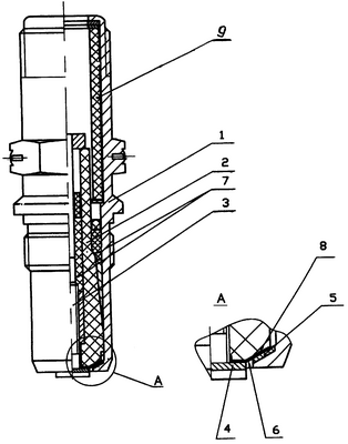 На фиг.1 приведена заявляемая свеча зажигания. Свеча содержит корпус 1, размещенный в нем искрообразующий изолятор 2, в канале которого размещен центральный электрод 3, имеющий контакт 4, образующий с контактом 5 корпуса 1 искровой зазор 6 на рабочем торце свечи, герметик 7 для закрепления центрального электрода 3 в канале искрообразующего изолятора 2 и искрообразующего изолятора 2 в корпусе 1, при этом по крайней мере один из контактов (бокового электрода или центрального электрода 3) выполняют из сплава, содержащего 80% серебра, палладия – остальное, а торцевая часть 8 искрообразующего изолятора 2 имеет фазовый состав: AL2SiO, Ag, CuO, Mn3О4, CuMn2O4, CuAl2О3. В свече имеется дополнительный изолятор 9 для обеспечения электропрочного соединения с высоковольтным проводом.