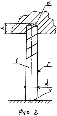 Пример 2. Изготовили опору мебели в виде стержня 1 (см. фиг.1) с верхней Б, нижней К и боковой Г поверхностями, причем стержень 1 опоры изготавливают в виде режущего инструмента – сверла трубчатого с присоединительной и режущей частями, причем режущую часть, в виде алмазного напыления, изготовили на верхней Б поверхности стержня, а присоединительную часть – на нижней К поверхности. Стержень 1 изготовили трубчатой формы с диаметром d=12 мм и высотой h=400 мм. Режущую часть изготовили в виде алмазного напыления. Материал стержня 1 (сверла) – инструментальная сталь.