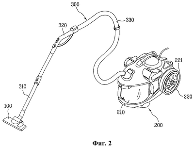 Как показано на фиг.2-5, пылесос, оснащенный всасывающей насадкой в соответствии с одним вариантом осуществления настоящего изобретения, включает всасывающую насадку 100, перемещающуюся по полу, для засасывания воздуха, содержащего частицы, корпус 200 пылесоса и соединительную трубку 300, соединяющую вместе всасывающую насадку 100 и корпус 200 пылесоса, для направления загрязненного воздуха в корпус 200 пылесоса. В корпусе 200 пылесоса предусмотрены всасывающее устройство (не показано), генерирующее всасывающую силу, и электрическое/электронное устройство (не показано) для управления пылесосом.