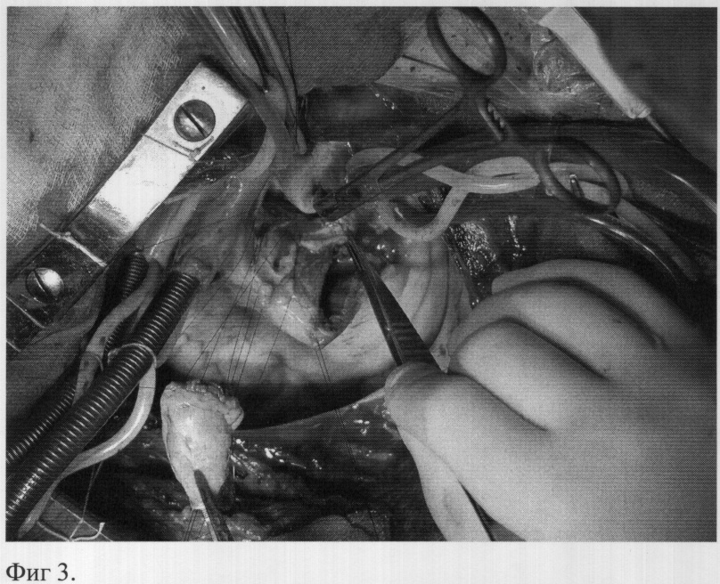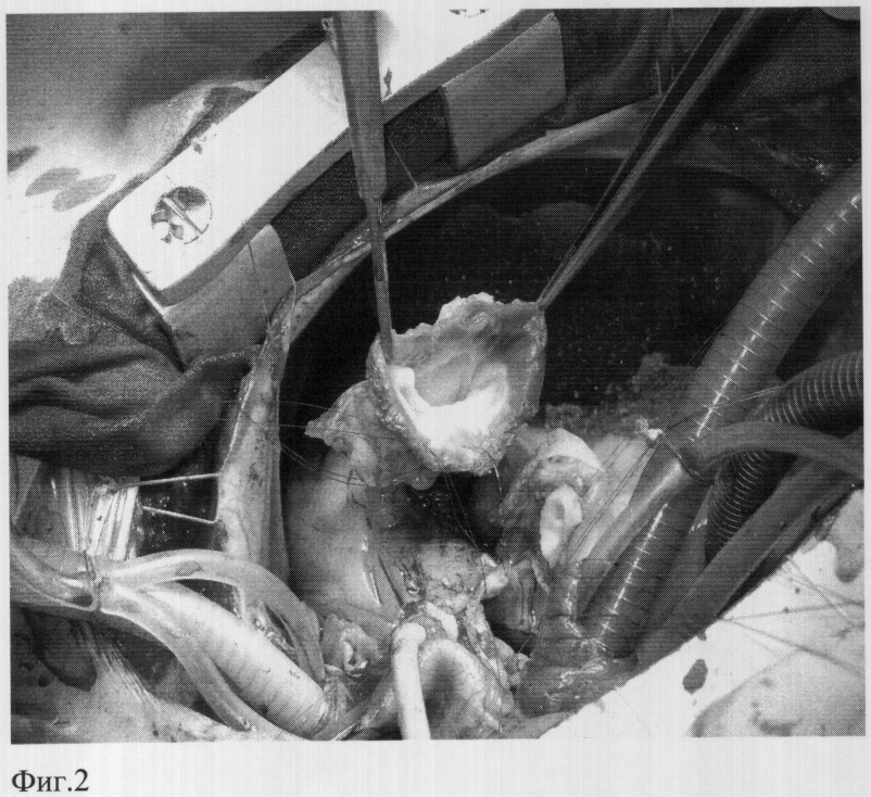 Имплантируют в аортальную позицию легочный аутографт, ориентируя его таким образом, чтобы существовало анатомическое соответствие устьев коронарных артерий синусам Морганьи, а также и соответствие мышечного продолжения аутографта дефекту основания аорты. Сначала проводят три П-образных шва (пролен 4/0) через комиссуры аутографта и через окружающие ткани в области локализовавшихся ранее комиссур корня аорты (фиг.3), аутографт выворачивают в левый желудочек и прошивают по основанию к тканям корня аорты обвивным швом от комиссуры до комиссуры, закрывая при этом дефекты корня аорты (фиг.4). Затем поочередно реимплантрируют устья коронарных артерий, левое, затем правое (пролен 5/0), формируют дистальный анастомоз между легочным аутографтом и восходящим отделом аорты. В позицию легочного ствола имплантируют биологический кондуит обвивными швами (дистальный анастомоз пролен 4/0, проксимальный пролен 3/0).