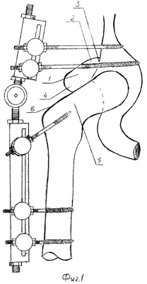 на фиг.1 изображена принципиальная схема артродеза тазобедренного сустава с фиксацией стержневым аппаратом;