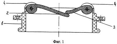 На фиг.1 представлен клапан в разрезе, створки в закрытом состоянии, на фиг.2 – то же, створки в открытом состоянии, на фиг.3 – вид клапана сверху. Клапан содержит кольцевой корпус 1, большую 2 и малую 3 створки, основания которых шарнирно соединены с четырьмя выступающими над корпусом крепежными дужками 4. Разный размер створок обусловлен необходимостью создания направления тока крови внутри полости желудочка, большая створка направляет поток в верхушку левого желудочка. Корпусная часть шарнира имеет Х-образную форму с гранями паза, ограничивающими движения створок. Каждый шарнир представляет собой полусферическую выемку на внутренней поверхности дужки, представляющую собой поверхность вращения, и ответного элемента в виде расположенного на створке выступа с боковой, полусферической поверхностью вращения. В качестве средства ограничения угла поворота в шарнире выступают грани паза, которые, взаимодействуя с торцевыми поверхностями выступов створок, совместно являются ограничителями движения створок. Таким образом, шарнир Х-образной формы выполняет функцию удержания створок в корпусе и функцию ограничения угла поворота створок из положения закрытия в положение открытия.