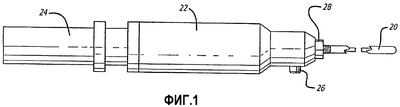 Во-первых, на Фиг.1 показан вид сбоку одного из вариантов осуществления устройства ультразвуковой липосакции согласно настоящему изобретению. В устройстве по Фиг.1 показаны трубка 20 отсоса, передний наконечник 22 и задний наконечник 24. Также на Фиг.1 виден аспирационный канал 26, выполненный с возможностью съемного прикрепления к аспирационному блоку, обеспечивающему отсасывание для удаления вещества из трубки 20 отсоса. Наконец, также на Фиг.1 показано регулировочное кольцо 28, которое удерживает трубку 20 отсоса по отношению к переднему наконечнику 22 в требуемом осевом положении.