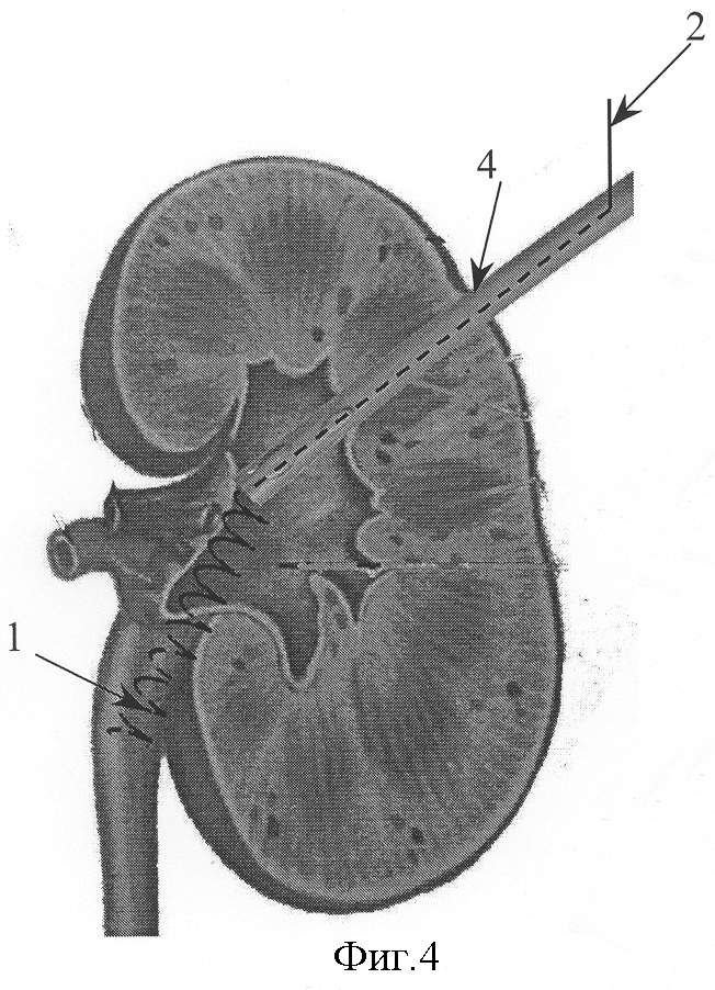 На фиг.4 показано дренирование лоханочно-мочеточникового сегмента. Неспиральная часть 2 небольшого (0,2-0,4 мм) диаметра не нарушает функции нефростомического дренажа 4 и обеспечивает удаление спирального дренажа 1 с оставлением нефростомы 4 для последующей оценки проходимости лоханочно-мочеточникового сегмента.