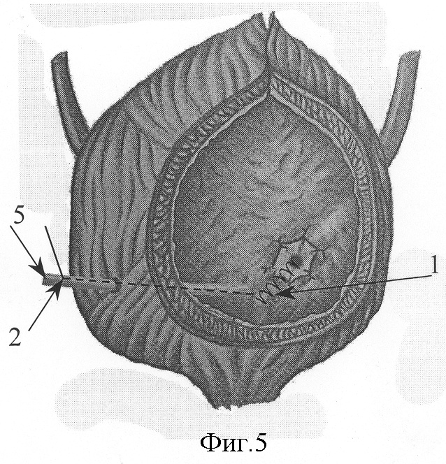 На фиг.5 показано дренирование пузырно-мочеточникового сегмента через эпицистостому 5 после уретероцистонеостомии.