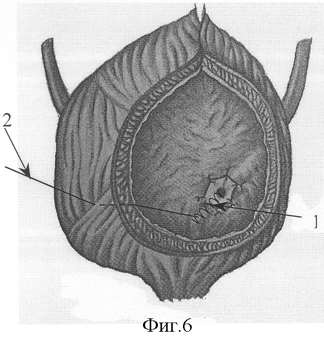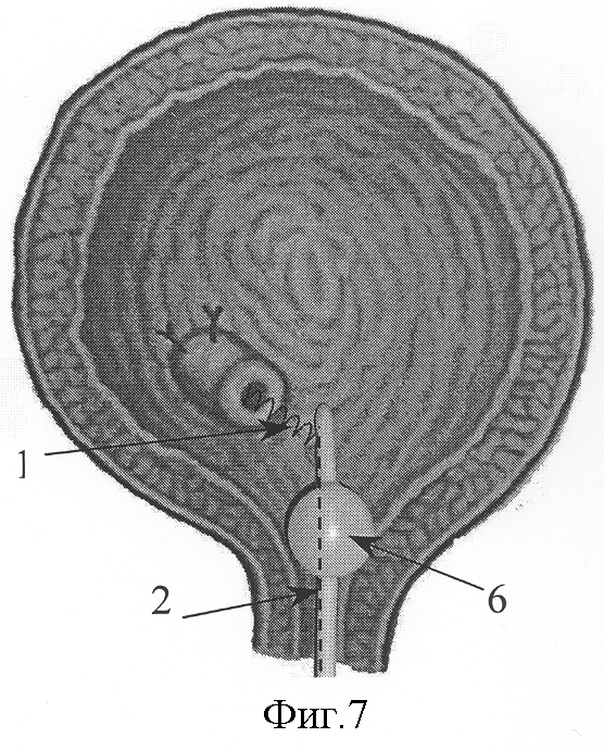 На фиг.7 показано дренирование пузырно-мочеточникового сегмента через уретральный катетер 6 после уретероцистонеостомии.