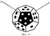 Указанная задача решена за счет того, что в игре, содержащей игровой элемент в виде додекаэдра, на грани которого нанесена маркировка математическими символами со знаками сложения и вычитания так, что из трех сходящихся в каждой вершине граней. одна отличается от двух других по знаку маркировки, согласно изобретению пять граней, замаркированных знаком вычитания, размещены в виде непрерывной замкнутой полосы вокруг грани, замаркированной математическим символом максимального значения со знаком сложения, а пять граней, замаркированных знаком сложения, размещены в виде непрерывной замкнутой полосы вокруг грани, замаркированной математическим символом максимального значения со знаком вычитания. Математические символы и знаки сложения и вычитания могут маркироваться точками, выделенными красящим веществом /и углублениями/ и различием граней по цвету; цифрами и знаками “плюс” и/или “минус”; а также с помощью других наглядных и легко доступных для понимания приемов и средств. Возможно использование дополнительных нематематических символов /”приз”, “штраф” и т.п./, которые могут быть размещены по типу граней, замаркированных математическими символами максимального значения, или быть включены в состав соответствующих непрерывных полос вокруг граней, замаркированных математическими символами максимального значения. В игре может использоваться один или несколько одинаковых или различающихся игровых элементов. Для улучшения перекатываемости игрового элемента возможно устройство округлений /скосов/ по линиям ребер и/или в вершинах додекаэдра. В комплект игры могут включаться емкость с открывающейся и закрывающейся крышкой /клапаном/ и инструкция, причем инструкция может быть нанесена непосредственно на поверхность емкости. Игровым полем может служить любая поверхность или пространство /в т.ч. компьютерное, информационное, телевизионное, виртуальное и т.п./, обеспечивающие устойчивую фиксацию случайно принятого положения игрового элемента после серии переворотов, составляющих игровой бросок.