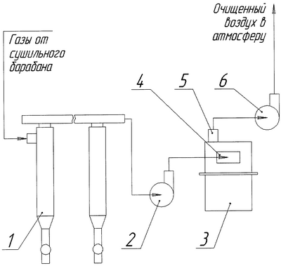 Предлагаемая установка для очистки газов от пыли содержит группу циклонов 1, вентилятор 2, мокрый пылеуловитель 3 с входным патрубком 4 и выходным патрубком 5, а также вентилятор 6.