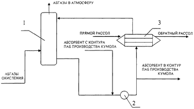 Опытно-промышленная абсорбционная установка предлагаемого способа очистки абгазов окисления от кумола отличается простотой аппаратурного оформления, включающего абсорбер, насос и холодильник (см. чертеж).