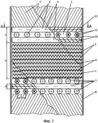 Компоновка пакетов и проставок как основных составляющих регулярной насадки таким образом, что отношение высоты пакета из гофрированных листов к высоте блока проставки находится в пределах 2÷5 обусловлено тем, что для выполнения проставкой функции турбулизатора и перераспределителя газовых и жидкостных потоков необходимо, чтобы ее высота была не менее 1/5 высоты пакета из гофрированных листов, с другой стороны, процессы тепло- и массообмена между фазами протекают в основном внутри пакета на поверхности гофрированных листов, поэтому высоту пакета из гофрированных листов целесообразно выполнять как минимум в 2 раза большей, чем высоту проставки.
