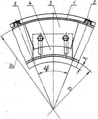 Цилиндрическая форма и радиальная жесткость просеивающей поверхности на наружном барабане диаметром D1 достигается подпором ее с помощью радиально закрепленных или регулируемых секторов 3 спиралей. Эти секторы крепятся болтами к кронштейнам 4, жестко установленным снаружи на цилиндрической поверхности внутреннего барабана диаметром D в кольцевом пространстве между ним и наружным барабаном с предусмотренной возможностью (вариантом) радиального перемещения в пространстве между наружным и внутренним барабаном и могут выполняться из износостойкого эластичного материала в пресс-форме. Таким образом, металлическая (или гуммированная) перфорированная цилиндрическая просеивающая поверхность внутреннего барабана служит для отделения скрапа и одновременно выполняет роль несущей консольной балки для предлагаемой конструкции барабанного классификатора. С этой целью внутренний барабан (бутара) с помощью соединенного с ним переднего фланца жестко крепится болтами или шпильками к разгрузочной горловине мельницы I стадии, образуя совместно с замыкающими продольными стержнями жесткую конструкцию из двух концентричных барабанов, в кольцевом пространстве между которыми радиальным размером устанавливаются кронштейны 4 и закрепляемые на них секторы 3 спирали, которые могут быть регулируемые и нерегулируемые (вариант). Параметры этой спирали, а также спиральных лифтеров 5 радиальной высоты h на внутренней цилиндрической поверхности бутары диаметром D подбираются экспериментально или с помощью расчетов по рабочим параметрам, величине загрузки мельницы и необходимой скорости ее осевой транспортировки.