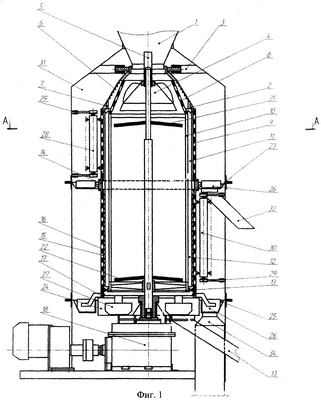 Центробежно-решетный сепаратор с вертикальной осью вращения состоит из неподвижной загрузочной горловины 1, конической обечайки 2, имеющей роликовую опору 3, питатель 4, установленный на приводном валу 5, с внутренней стороны конической обечайки 2 расположены ступени 6 и со стороны большого основания гасители окружной скорости 7, коническое делительное решето 8, прикрепленное верхним основанием к конической обечайке 2, цилиндрическое подсевное решето 9, верхним основанием жестко прикрепленное к конической обечайке 2. Внутри цилиндрического подсевного решета 9 соосно с ним установлен двухсекционный пластинчатый барабан 10, жестко связанный с приводным валом 5. Пластинчатый барабан 10 содержит пластины подсевной секции 11 и пластины зерновой секции 12, к нижнему основанию пластинчатого барабана прикреплена кольцевая щетка 13. Подсевное решето 9 посредством опорного кольца 14 своим нижним основанием соединено с цилиндрическим зерновым решетом 15, имеющим на внутренней поверхности спираль 16, и связанное своим нижним основанием с цилиндрической обечайкой 17, которая жестко связана с приводом 18, имеющим два соосных выхода. Привод 18 жестко связан также с приводным валом 5. Коническое делительное решето 8 своим нижним основанием входит с радиальным зазором внутрь пластинчатого барабана 10 с перекрытием в осевом направлении. Пластины подсевной секции 11 имеют пластинчатую полку 19, которые образуют щелевое решето 20. Эластичные кольца 21 и 22 жестко связаны с приводным валом 5. Для сбора фракций сепаратор имеет приемник мелкой фракции 23, приемник крупной фракции 24 и приемник очищенного зерна 25, содержащие соответственно скребки 26 в приемниках 23, 24 и скребки 27 в приемнике крупной фракции 24. Цилиндрическое подсевное решето с наружной стороны оснащено очистительной щеткой 28, имеющей механизм прижатия щетки 29. Зерновое решето также с наружной стороны имеет очистительную щетку 30 с механизмом прижатия щетки 29. Сепаратор содержит также корпус 31 и патрубки 32, 33, 34 для вывода мелких, крупных примесей и очищенного зерна соответственно.