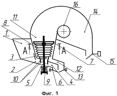 Сущность изобретения поясняется чертежами: на фиг.1 – общий вид устройства, на фиг.2 – то же с приподнятой горловиной, на фиг.3 – сечение А-А.