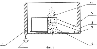 Классификатор состоит из вибропривода 1, обечайки 2 с отверстиями 3, 4, сплошной металлической панели 5, жестко закрепленной на нижней кромке обечайки 2, емкости питателя 6 с прорезью 7 для подачи порошка на панель 5 из питателя 6, ситового полотна 8, установленного над питателем 5, желоба 9, ребер 10, образующих каналы 11, и промежуточных ребер 12. Высота ребер 10 рассчитывается по известной формуле: