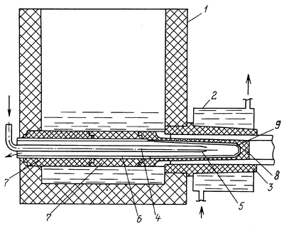 Из других областей металлургии известен способ охлаждения газово-жидкостной смесью конца копья, используемого для измерений свойств расплава, или кислородного копья (фурмы) для продувки расплава кислородом (патент Германии, С21С 5/46, F27D 9/00, номер и дата международной публикации WO 99/46412, 16.09.1999 г.). Применительно к назначению этих устройств указанные выше проблемы безопасности (паровой взрыв) практически отсутствуют, так как копья для измерений и кислородные фурмы вводятся в расплав сверху, кратковременно и периодически, а не в непрерывном режиме.