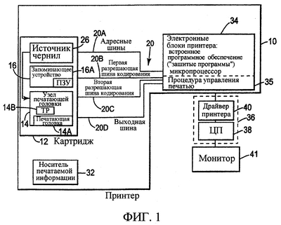 На фиг. 1 представлена электрическая блок-схема основных компонентов струйного принтера в соответствии с одним конкретным вариантом осуществления настоящего изобретения. Струйный принтер 10 включает в себя сменный картридж 12 для струйной печати, который включает в себя узел 14 печатающей головки для струйной печати, запоминающее устройство 16 и источник 26 чернил. Картридж 12 для струйной печати является сменным и выполнен с возможностью извлечения из принтера 10. Узел 14 печатающей головки для струйной печати включает в себя, по меньшей мере, одну печатающую головку 14А и терморезистор (ТР) 14В. Запоминающее устройство 16 может включать в себя многочисленные формы запоминающих устройств, такие как оперативное запоминающее устройство (ОЗУ), постоянное запоминающее устройство (ПЗУ) и электрически стираемое программируемое постоянное запоминающее устройство (ЭСППЗУ), и хранит данные, связанные с узлом 14 печатающей головки для струйной печати и источником 26 чернил. В одном конкретном варианте осуществления запоминающее устройство 16, в частности, содержит записанные данные завода-изготовителя и зарегистрированные данные принтера. В одном конкретном варианте осуществления запоминающее устройство 16 включает в себя 26-разрядное ПЗУ 16А, имеющее 13 «пережигаемых» двоичных разрядов и 13 «маскированных» двоичных разрядов. В альтернативном конкретном варианте осуществления все 26 двоичных разрядов в ПЗУ 16А являются пережигаемыми двоичными разрядами. При наличии пережигаемых двоичных разрядов эти пережигаемые двоичные разряды могут быть пережжены нужной аппаратурой в любой момент эксплуатации изделия. Таким образом, использование пережигаемых двоичных разрядов обеспечивает большую степень гибкости. В отличие от них, маскированные двоичные разряды являются «жестко закодированными» двоичными разрядами, которые определены в процессе изготовления.