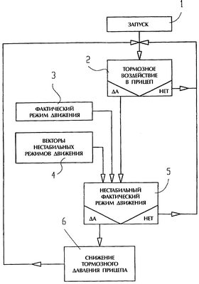 Если же имеет место критический режим движения, то на этапе 6 тормозные моменты колес прицепа или тормозное давление прицепа модулируют, т.е. тактируют. Тормозное давление прицепа или тормозные моменты колес, следовательно, кратковременно снижаются. Затем возвращаются к этапу 2 и весь алгоритм проверки проходят заново.