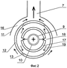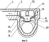 Тройник имеет корпус 1 с кронштейном 2 для крепления к раме вагона. Он оснащен патрубками 3 и 4 с наружной резьбой для подсоединения штуцеров трубопровода воздушной тормозной магистрали (на чертеже не показаны). Между патрубками расположена полость воздушной магистрали 5. В верхней части тройника, содержащей крепежный кронштейн 2, имеется вторая полость 6 с входом в контур трубопроводов воздухораспределителя 7. Полости 5 и 6 соединены отверстием 8 в корпусе тройника, на образующей которого сделаны выступы 9, используемые для установки на них конической вставки 10. Полость 6 ограничивается крышкой 11 лабиринтного узла, цилиндрическое или коническое кольцо 12 которого опирается на коническую вставку 10. В кольце напротив друг друга под углом к входу в контур магистрали воздухораспределителя 7 расположены отверстия 13. Наружная поверхность конической вставки 10 и образующая поверхность отверстия на корпусе создают некую полость 14, так называемый карман, в котором задерживается часть посторонних частиц при опрокидывании грузового вагона. С торца патрубков 3 и 4, там где подсоединяются штуцера трубопровода воздухораспределителя, вводятся уплотняющие элементы 15. Стрелками на чертеже показано движение воздушного потока в направлении входа в контур воздухораспределителя. Более подробно лабиринтный характер движения воздушных потоков показан на фиг.2. Здесь изображены коническая вставка 10, крышка 11 с кольцом 12, в котором выбраны отверстия 13, расположенные к входу в контур воздухораспределителя под некоторым углом. Кольцо и образующая поверхность корпуса образуют лабиринтный проход 16 для воздуха в контур воздухораспределителя. По крайней мере, может иметься еще одно дополнительное кольцо 17 с отверстиями 18 в нем, которое вместе с внутренней поверхностью кольца 12 создают дополнительный лабиринтный проход 19 для воздуха. Высота и форма места соприкосновения дополнительного кольца 17 с конической вставкой 10 выбирается таким образом, чтобы исключить возможность прохождения воздуха, минуя отверстия 18. Указанные отверстия располагаются под углом и/ или перпендикулярно относительно отверстий 13. Стрелками показано направление движения воздушных потоков при рабочих режимах тормозной магистрали. На общем виде фиг.3 в разрезе кроме указанных деталей приведен зонтик 20 над конической вставкой 10.