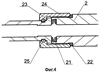 На фиг.4 детально показано техническое решение для уплотнений мест стыковки со штуцерами трубопроводов. Здесь 2 – патрубок с наружной резьбой и местами для установки уплотняющих элементов 21 и 22. К уплотняющему элементу 21 подводится торец штуцера трубопровода 23 и поджимается гайкой 24. Дополнительно между гайкой и корпусом тройника может быть установлено эластичное уплотнение 22. Проволочный штифт 25 ограничивает перемещение гайки и используется для ее фиксации. При использовании рабочих режимов (зарядка, отпуск) воздушное давление в магистрали повышается и, следовательно, легкие посторонние частицы могут поступать в контур воздухораспределителя. Заявляемые изменения в конструкции тройника, а именно лабиринтное поступление воздуха, наличие кармана возле входного отверстия в контур воздухораспределителя и защитный зонтик над входным отверстием позволяют снизить поступление примесей и влаги в контур магистрали воздухораспределителя и значительно повысить надежность воздушной тормозной магистрали. Такой же эффект будет наблюдаться и при разгрузке грузовых вагонов путем опрокидывания. Давление при этом не изменяется, и нет движения воздуха. Посторонние включения при опрокидывании могут попасть под действием силы тяжести, прежде всего, в карман и там задержаться. А от прямого проникновения в контур воздухораспределителя защитой послужит зонтик над входным отверстием. Надежность воздушной тормозной магистрали повышается также и при замене внутренних резьбовых соединений на наружные с использованием эластичных уплотняющих прокладок. Для такого использования в основании патрубка делается специальная проточка под форму эластичной прокладки. При этом форма прокладки может быть как простой прямоугольной, так и в виде манжеты, использующей эффект дополнительного поджатия со стороны повышенного давления. Вращающаяся гайка поджимает плоскость штуцера трубопровода к эластичной прокладке, чем и достигается необходимая плотность соединения. После требуемого поджима гайка стопорится штифтом. Поэтому указанные изменения в конструкции приводят и к упрощению сборочных работ при монтаже тройника или ремонтных работах.