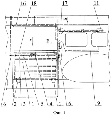 На боковой стенке дверного проема 8 прикреплено вертикально расположенное основание кронштейна 19 узла блокировки штыревого замка с консольным отрезком направляющей 20, примыкающим с зазором С к торцу нижней направляющей 18 на ее прямом концевом участке. Консольный отрезок направляющей 20 предназначен для размещения нижнего ролика 15 при перемещении створки 9 в полностью открытое положение (фиг.3). Снизу под консольным отрезком направляющей 20 поверхность подножки 3 имеет поднутрение, обеспечивающее получение зазора C1 с корпусом нижней створки 1. Упомянутые монтажные зазоры обеспечивают беспрепятственное взаимное перемещение элементов конструкции при повороте откидной нижней створки 1.