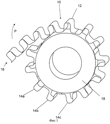 На фиг.1 показан моток 10, состоящий из металлической полосы 12, имеющей некоторое количество выступов 14а, 14b, 14с …. В представленном примере осуществления изобретения выступы 14 выполнены в виде выпуклостей на металлической полосе 12. Разделением металлической полосы 12 между каждыми двумя выступами получают зажимы для упаковочных установок. Металлическая полоса намотана на катушку 18 и имеет один единственный виток. Впереди в направлении размотки металлической полосы 12 находится свободный конец 16. Без закрепления указанный свободный конец 16 перемещался бы в направлении стрелки Р в сторону от катушки 18.