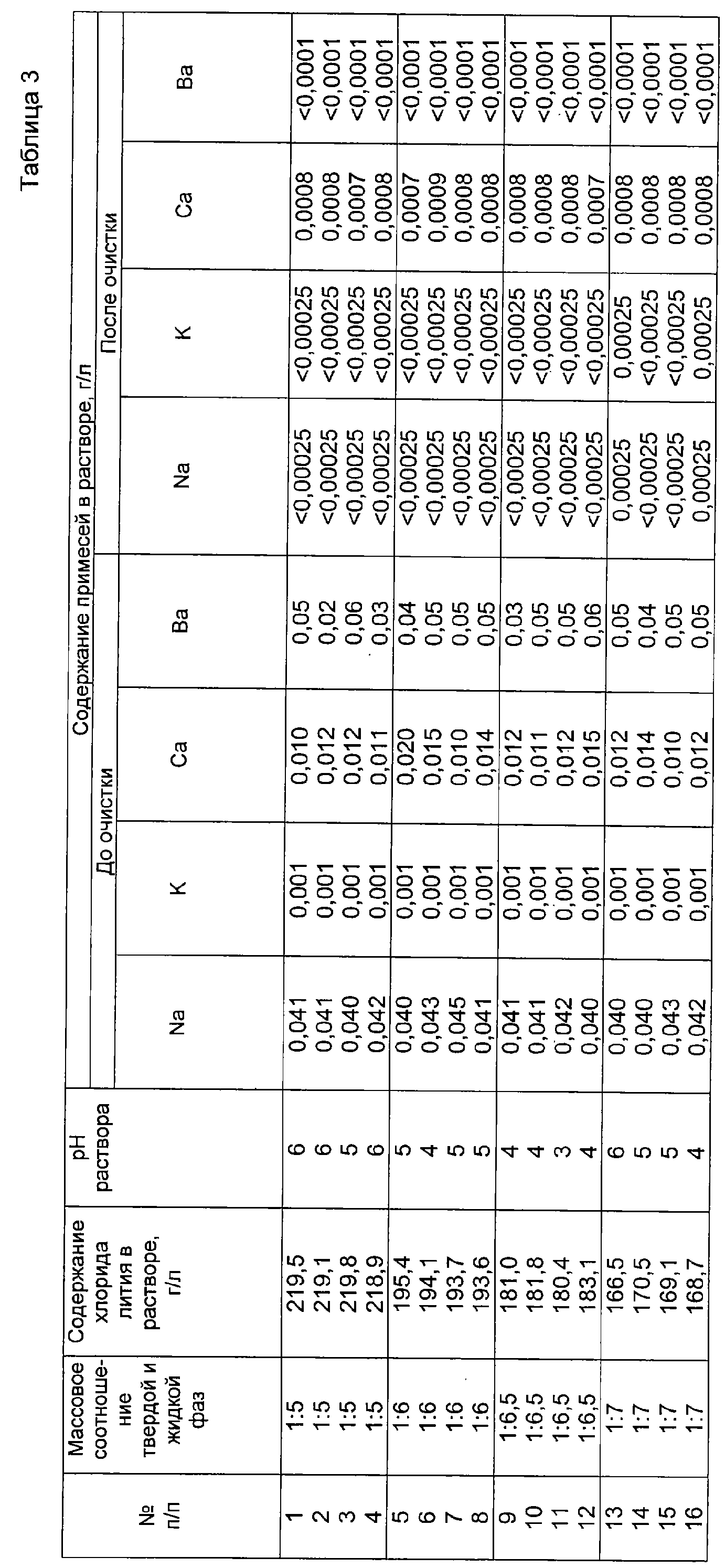 Результаты процесса при различных режимах приведены в таблице 3. Таким образом, использование изобретения позволяет получать в непрерывном режиме из технического карбоната лития высококачественный хлорид лития, пригодный для дальнейшего получения из него лития металлического батарейного сорта.