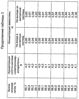 Ртуть из разлагателя амальгамы возвращают на электролиз. Амальгаму лития концентрацией 0,95 N получают электролизом на проточном ртутном катоде в электролизере 21 из концентрированного 4,0 N водного раствора гидроксида лития, циркулирующего в количестве 6 м3/ч в отдельном контуре “электролизер – испаритель”, поддерживая постоянную 4 N концентрацию раствора гидроксида лития в электролизере 21 путем испарения воды в испарителе 22, после чего полученную амальгаму вводят в контактную систему.