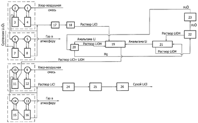 В финишных третьей и четвертой цепочках абсорбции системы газоочистки и улавливания хлора смесь водного раствора хлорида и гидроксида лития, содержащая до 20% лития в виде гидроксида, циркулирует в абсорберах навстречу газовому хлор-воздушному потоку, в присутствии железоникелевого катализатора до рН раствора меньше 7, после чего полученный хлоридный раствор подвергают повторной очистке от примесей алюминия, железа, никеля, кремния химическим осаждением на участке 24, а также упариванию в выпарном аппарате 25 и обезвоживанию в сушилке 26 до получения сухого хлорида лития.