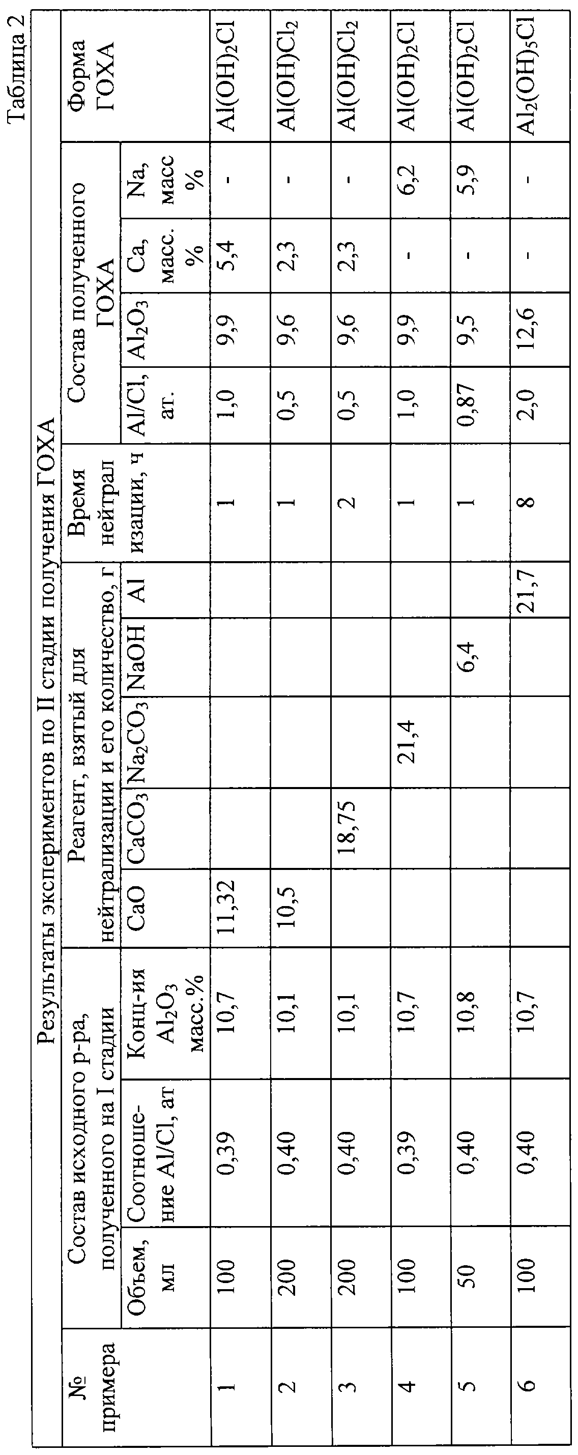 Изобретение относится к химической промышленности и цветной металлургии, которые связаны с производством соединений алюминия, направляемых для получения коагулянтов, в частности, может быть применено при получении гидроксохлорида алюминия, который находит широкое применение в различных отраслях промышленности и наиболее эффективен при очистке питьевых и сточных вод. Известны способы получения гироксохлорида алюминия из различных видов алюминийсодержащего сырья: алюминиевых отходов, гидроксида алюминия, металлического алюминия и др. путем взаимодействия их с соляной кислотой (Запольский А.К, Баран А.А., «Коагулянты и флокулянты в процессе очистки воды», Л. Химия, 1987 г., с.89-96). Наиболее близким к предлагаемому является способ получения гидроксохлорида алюминия (ГОХА) путем взаимодействия товарного технического гидроксида алюминия (ГА) с соляной кислотой с последующей доводкой полученного кислого раствора нейтрализацией до желаемой основности гидроксихлорида алюминия (SU 260624, опубл. 05.05.1970). Основными недостатками данного способа являются низкие коагулирующие свойства продукта, длительность процесса. Задачей данного изобретения является получение продукта с высокими потребительскими качествами, наиболее эффективно проявляющимися при коагулировании различных природных вод с получением питьевой воды, соответствующей требованиям ГОСТа, а также ускорение процесса. Поставленная задача достигается способом, который проводят в две стадии. На первой стадии технический гидроксид алюминия растворяют в соляной кислоте при атмосферном давлении и температуре кипения раствора при избытке гидроксида алюминия по отношению к стехиометрии, равном 20-100%, с получением раствора гидроксохлорида алюминия с атомным отношением Al/Cl=0,35-0,45, на второй стадии проводят нейтрализацию полученного раствора гидроксохлорида алюминия с получением раствора заданной основности и концентрацией по Al2O3 9,0-12,6 мас.%. Для растворения технического гидроксида алюминия используют соляную кислоту концентрации 15-25 мас.%. На второй стадии нейтрализации раствора гидроксохлорида алюминия используют карбонат натрия или гидроксид натрия, или карбонат кальция, или оксид кальция, или гидроксид кальция, или металлический алюминий. Для проведения двухстадийного процесса особенно важно провести первую стадию процесса до получения значительного количества (30-60%) низкоосновного гидроксохлорида алюминия. Основность полученного продукта на I стадии предлагается характеризовать атомным соотношением алюминия к хлору: Al/Cl=0,35-0,45. В результате опытов было установлено, что использование избыточных против стехиометрии количеств гидроксида алюминия в пределах 20-100% позволяет при сравнительно небольшом времени реакции (4 часа) получать низкоосновный гидроксохлорид алюминия с атомным отношением Al/Cl=0,35-0,45, тогда как при стехиометрических соотношениях реагентов для получения даже раствора хлорида алюминия (атомное отношение Al/Cl=0,33) требуется значительное большее время (до 12-18 часов), а за 4 часа можно получить только продукт с атомным отношением 0,29 (табл.1 оп.1). Концентрация соляной кислоты была выбрана, исходя из скоростей реакции и необходимости получить продукт с определенным содержанием Al2О3 в растворе. Более низкие концентрации соляной кислоты (табл.1 оп.7, 8) не по