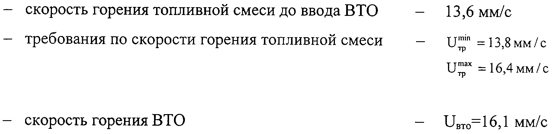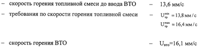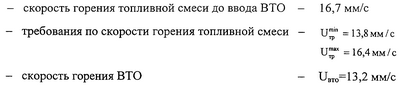 где M – масса топливной смеси до ввода возвратных технологических отходов, т, Uсм – скорость горения образца топлива, мм/с, UBTO – скорость горения возвратных технологических отходов, мм/с, к – корректирующий коэффициент, равный 1,2.