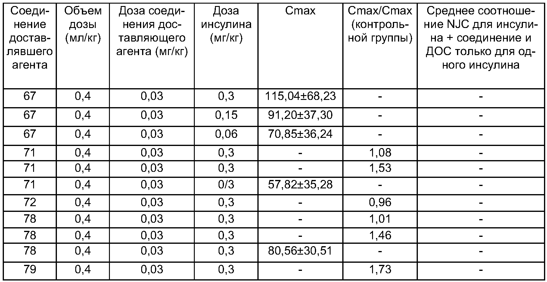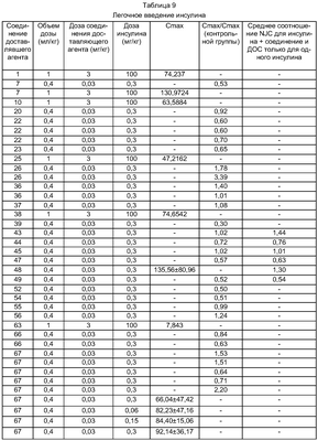 Пример 9. Инсулин – легочное введение Лекарственные композиции, содержащие соединение доставляющего агента и инсулин человека, получают в воде. В частности, к 1,5 мг соединения доставляющего агента добавляют деионизированную воду, доводя объем до 1,0 мл, и подвергают раствор вихревому перемешиванию. Используют натриевую соль соединения доставляющего агента, либо свободную кислоту превращают в натриевую соль, для чего к полученному раствору при перемешивании добавляют один эквивалент гидроксида натрия (10 н. раствор) и разбавляют водой. Раствор подвергают вихревому перемешиванию, затем нагревают (около 37°С) и обрабатывают ультразвуком. Показатель рН доводят примерно до 7,0-8,5, добавляя NaOH или HCl. К полученному раствору добавляют 75 мкл исходного раствора инсулина человека (2 мг/мл). (Исходный раствор получают следующим образом. К 0,02 г инсулина добавляют 3 мл раствора HCl с рН 3,0 в деионизированной воде. Показатель рН полученного раствора понижают до 3,0 (примерно 2,6), добавляя HCl и NaOH, пока раствор не становится прозрачным. Затем показатель рН повышают до 7,6, используя NaOH и HCl. Конечный объем доводят до 10 мл деионизированной водой с рН 7,5. Конечный рН равен 7,59). Затем добавляют воду до достижения общего объема, равного 2,0 мл, после чего сосуд с раствором несколько раз осторожно переворачивают. Конечные дозы соединения доставляющего агента, инсулина и объемы дозы приведены в нижеследующей таблице 9. Обычно используют описанные ниже методики определения требуемой дозы и отбора проб. Самцов крыс Sprague-Dawley с массой тела 200-250 г не кормят в течение 24 часов, после чего им вводят кетамин (44 мг/кг) и хлорпромазин (3,0 мг/кг) за 15 минут до введения лекарственного средства и при необходимости производят повторное введение анестезирующих средств для обеспечения необходимой степени наркоза (используют такое же количество кетамина и 1,5 мг/кг хлорпромазина). Экспериментальной группе из пяти животных вводят один из лекарственных растворов. Контрольной группе из пяти животных вводят только инсулин. Трахеальный инстиллятор для грызунов, оснащенный лампой (фирмы Perm Century, Inc., Pittsburgh, PA), заполняют лекарственным раствором и вводят в горло так, чтобы игла вошла в трахею (с визуальной проверкой). Подачу лекарственного раствора осуществляют нажатием на поршень. Пробы крови отбирают у всех животных из хвостовой артерии через промежутки времени, равные обычно 5, 15, 30, 60 и 120 минутам. Уровни инсулина в сыворотке определяют при помощи тест-набора для анализа инсулина методом ELISA (набор № DSL-10-1600 фирмы Diagnostic Systems Laboratories, Inc., Webster, TX), причем в стандартную процедуру анализа вносят изменения для оптимизации чувствительности и линейного диапазона стандартной кривой, отображающей объемы и концентрации проб, используемых в данном анализе. Концентрации инсулина в сыворотке (мкед./мл) измеряют для каждого промежутка времени у каждого из пяти животных в каждой экспериментальной группе. Пять значений для каждого промежутка времени усредняют и строят график концентрации инсулина в сыворотке в зависимости от времени. Ниже приведены соотношения площадей под кривой (AUC) для экспериментальной группы и контрольной группы. В нижеследующей таблице приведены также соотношения максимальных концентраций инсулина в сыворотке (Cmax) для экспериментальной группы и контрольной группы. Пример 10. К