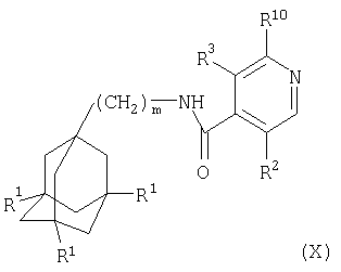 X представляет собой атом кислорода или серы или группу >N-R8; n означает 0 или 1; R5 представляет собой С2-С3алкильную группу, возможно замещенную по меньшей мере одной гидроксильной группой; каждый из R6 и R7 независимо представляет собой атом водорода или C1-С5алкильную группу, возможно замещенную одной или двумя гидроксильными группами; R8 представляет собой атом водорода или С2алкильную группу, замещенную по меньшей мере одной гидроксильной группой. 11. Соединение, выбранное из числа следующих: N-(1-Адамантилметил)-5-хлор-2-{3-[(3-гидроксипропил)-амино]пропил}изоникотинамид, N-(1-Адамантилметил)-5-хлор-2-{3-[(3-гидроксипропил)амино]пропил}-изоникотинамида дигидрохлорид, N-(1-Адамантилметил)-2-хлор-5-{3-[(3-гидроксипропил)амино]пропил}никотинамид, N-(1-Адамантилметил)-2-хлор-5-(3-{[(1S)-2-гидрокси-1-метилэтил]амино}пропил)никотинамид, N-(1-Адамантилметил)-2-хлор-5-(3-{[(1R)-2-гидрокси-1-метилэтил]амино}пропил)никотинамид, N-(1-Адамантилметил)-2-(3-аминопропил)-5-хлоризоникотинамида гидрохлорид, N-(1-Адамантилметил)-5-хлор-2-[3-(этиламино)пропил]изоникотинамида гидрохлорид, N-(1-Адамантилметил)-5-хлор-2-({2-[(3-гидроксипропил)амино]-этил}тио)изоникотинамида гидрохлорид, N-(1-Адамантилметил)-5-хлор-2-(3-{[(1R)-2-гидрокси-1-метилэтил]амино}пропил)изоникотинамида дигидрохлорид, N-(1-Адамантилметил)-5-хлор-2-(3-{[(1S)-2-гидрокси-1-метилэтил]амино}пропил)изоникотинамида дигидрохлорид, N-(1-Адамантилметил)-5-хлор-2-{3-[(2-гидроксиэтил)амино]пропил}-изоникотинамида гидрохлорид, N-(1-Адамантилметил)-5-хлор-2-{2-[(3-гидроксипропил)амино]этокси}изоникотинамида гидрохлорид, N-(1-Адамантилметил)-5-хлор-2-({2-[(2-гидроксиэтил)амино]этил}-амино)изоникотинамида дигидрохлорид, N-(1-Адамантилметил)-5-хлор-2-[3-(изопропиламино)пропил]изоникотинамида дигидрохлорид, N-(1-Адамантилметил)-5-хлор-2-(3-{[(2S)-2-гидроксипропил]амино}пропил)изоникотинамида дигидрохлорид, N-(1-Адамантилметил)-5-хлор-2-(3-{[(2R)-2,3-дигидроксипропил]амино}пропил)изоникотинамида дигидрохлорид, N-(1-Адамантилметил)-5-хлор-2-(3-{[(2S)-2,3-дигидроксипропил]амино}пропил)изоникотинамида дигидрохлорид, N-(1-Адамантилметил)-5-хлор-2-{3-[(4-метилциклогексил)амино]пропил}изоникотинамида дигидрохлорид, N-(1-Адамантилметил)-5-хлор-2-{3-[(2-гидрокси-2-метилпропил)амино]пропил}изоникотинамида дигидрохлорид, N-(1-Адамантилметил)-5-хлор-2-(3-{[(1R)-1-(гидроксиметил)-2-метилпропил]амино}пропил)изоникотинамида дигидрохлорид, N-(1-Адамантилметил)-5-хлор-2-(3-{[2-(метиламино)этил]амино}пропил)изоникотинамида дигидрохлорид, N-(1-Адамантилметил)-5-хлор-2-(3-{[3-(метиламино)пропил]амино}пропил)изоникотинамида бис(трифторацетат), N-(1-Адамантилметил)-5-хлор-2-[3-({2-[(2-гидроксиэтил)амино]этил}амино)пропил]изоникотинамида дигидрохлорид, N-(1-Адамантилметил)-5-хлор-2-(3-{[2-(диэтиламино)этил]амино}пропил)изоникотинамида дигидрохлорид, N-(1-Адамантилметил)-5-хлор-2-(3-{[2-гидрокси-1-(гидроксиметил)этил]амино}пропил)изоникотинамида дигидрохлорид, N-(1-Адамантилметил)-5-хлор-2-{3-[(2-гидроксиэтил)(метил)амино]пропил}изоникотинамида дигидрохлорид, N-(1-Адамантилметил)-5-хлор-2-{3-[(3-гидрокси-2,2-диметилпропил)амино]пропил}изоникотинамида дигидрохлорид, N-(1-Адамантилметил)-5-хлор-2-(3-{[(2R)-2-гидроксипропил]амино}пропил)изоникотинамида дигидрохлорид, N-(1-Адамантилметил)-5-хлор-2-({[3-(метиламино)пропил]амино}метил)изоникотинамида дигидрохлорид, N-(1-Адамантилметил)-5-хлор-2-[({2-[(2-гидроксиэтил)амино]этил}амино)метил]изоникотинамида дигидрохлорид, N-(1-Адамантилметил)-5-хлор-2-({[2-(м