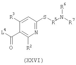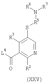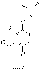 где L7 представляет собой подходящую уходящую группу, такую как атом галогена, и R2, R3 и L4 такие, как определено в формуле (XXIV), с тиолом формулы