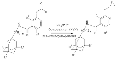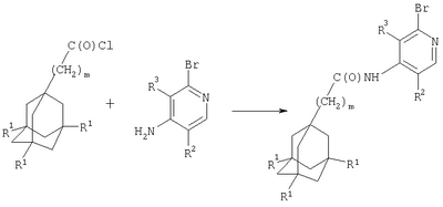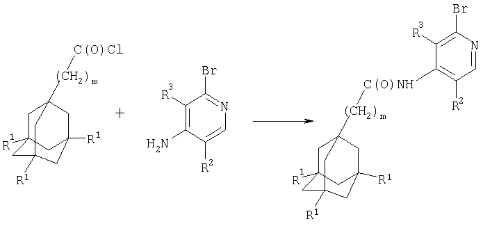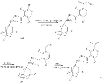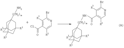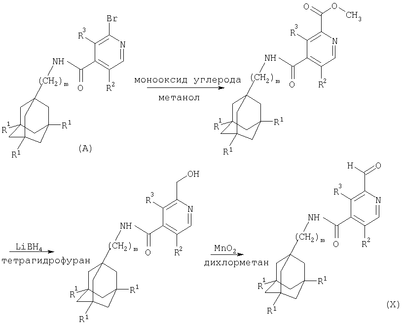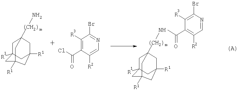 (1) 2-Бром-5-хлоризоникотиновая кислота К перемешиваемому раствору диизопропиламина (16 мл) в безводном тетрагидрофуране (300 мл) при -5°С добавляли по каплям раствор н-бутиллития в гексане (2,5 молярный, 44 мл) и полученный раствор перемешивали в течение 30 минут и затем охлаждали до -70°С. К охлажденному раствору добавляли раствор 2-бром-5-хлорпиридина (19,2 г) в безводном тетрагидрофуране (50 мл), поддерживая внутреннюю температуру реакции ниже -65°С. Реакцию поддерживали при -70°С в течение 15 минут и затем через реакционную смесь пропускали постоянный поток сухого диоксида углерода в течение 30 минут. Реакционную смесь оставляли нагреваться до комнатной температуры и вливали ее в смесь воды (300 мл) и водного раствора гидроксида натрия (2 М, 30 мл). Смесь экстрагировали диэтиловым эфиром (2×100 мл) и объединенные эфирные экстракты снова экстрагировали водным раствором гидроксида натрия (1 М, 2×100 мл). Объединенные водные экстракты подкисляли до рН 1 концентрированной соляной кислотой и полученное твердое вещество отфильтровывали и высушивали под вакуумом при 50°С с получением указанного в подзаголовке соединения в виде белого твердого вещества (14,1 г). 1H-ЯМР (300 МГц, ДМСО-d6) Т.пл.: 246-247°С (разл.). (2) N-(1-Адамантилметил)-2-бром-5-хлоризоникотинамид К перемешиваемой суспензии 2-бром-5-хлоризоникотиновой кислоты (5,0 г) в безводном дихлорметане (30 мл) прибавляли диметилформамид (1 капля), затем оксалилхлорид (3,7 мл). Реакционную смесь перемешивали при комнатной температуре в течение 2 часов и затем выпаривали досуха, подвергая азеотропной перегонке с толуолом. Остаток суспендировали в этилацетате (100 мл) и охлаждали до 5°С, куда по каплям добавляли раствор 1-адамантилметиламина (3,47 г) и триэтиламина (7,0 мл) в этилацетате (10 мл). Смесь перемешивали в течение 2 часов и затем вливали в воду и полученное твердое вещество отфильтровывали и высушивали под вакуумом при 40°С с получением указанного в подзаголовке соединения в виде белого твердого вещества (8,05 г). 1H-ЯМР (400 МГц, CDCl3) Т.пл.: 153-155°С (разл.). МС (масс-спектр): ХИАД(+ve) (ХИАД, химическая ионизация при атмосферном давлении) 383/385 (М+1). (3) N-(1-Адамантилметил)-5-хлор-2-(3-гидрокси-1-пропинил)изоникотинамид Смесь N-(1-адамантилметил)-2-бром-5-хлоризоникотинамида (Пример 1(2)) (0,96 г), пропаргилового спирта (0,16 г), йодида меди(I), бис-трифенилфосфинпалладия дихлорида (0,035 г) и диэтиламина (10 мл) перемешивали при комнатной температуре в течение 20 часов. Смесь концентрировали и остаток распределяли между этилацетатом и 1 М водным раствором соляной кислоты (2×25 мл) и эту смесь экстрагировали в этилацетат (3×25 мл). Объединенные экстракты высушивали над безводным сульфатом магния, фильтровали и концентрировали. Остаток очищали посредством хроматографии на силикагеле, элюируя смесью этилацетат:изогексан (от 1:4 до 1:1) и затем этилацетатом с получением указанного в подзаголовке соединения (0,48 г) в виде масла. 1Н-ЯМР (400 МГц, CDCl3) MC: ХИАД(+ve) 359/361 (М+1). (4) N-(1-Адамантилметил)-5-хлор-2-(3-гидроксипропил)изоникотинамид Смешанную суспензию N-(1-адамантилметил)-5-хлор-2-(3-гидрокси-1-пропинил)изоникотинамида (Пример 1(3)) (0,48 г) и 5% родия на углероде (0,020 г) перемешивали при положительном давлении (3 бар, 0,3 МПа) водорода до тех пор, пока наблюдалось поглощение. Смесь фильтровали и концентрировали. Остаток очищали посредством хроматографии на силикагеле, элюируя этилацетатом, с получе