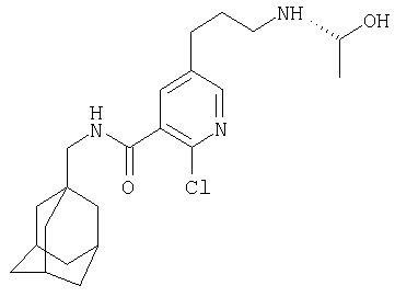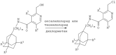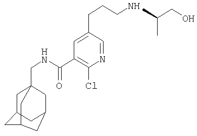 (1) N-(1-Адамантилметил)-5-йод-2-хлорникотинамид К тионилхлориду (10 мл) добавляли 2-гидрокси-5-йодникотиновую кислоту (2,65 г), затем безводный N,N-диметилформамид (1 капля) и полученную суспензию нагревали до 100°С в течение 3 часов. Смесь охлаждали и концентрировали, подвергая азеотропной перегонке с толуолом. Остаток растворяли в сухом дихлорметане (70 мл), охлаждали до 0°С и добавляли по каплям смесь 1-адамантилметиламина (1,65 г) и триэтиламина (2,81 мл) в сухом дихлорметане (30 мл). Реакционную смесь перемешивали в течение 1 часа, промывали 0,5 М водным раствором соляной кислоты, высушивали над безводным сульфатом магния, фильтровали и концентрировали. Остаток очищали посредством хроматографии на силикагеле, элюируя смесью этилацетат:дихлорметан (1:9) с получением указанного в подзаголовке соединения в виде твердого вещества. 1H-ЯМР (300 МГц, CDCl3) MC: ХИАД(+ve) 430/432 (М+1). Т.пл.: 163-164°С. (2) N-(1-Адамантилметил)-2-хлор-5-(3-оксопропил)никотинамид Смесь N-(1-адамантилметил)-5-йод-2-хлорникотинамида (Пример 3(1)) (2,15 г), аллилового спирта (0,58 г), ацетата палладия(II) (0,015 г), бикарбоната натрия (1,05 г) и хлорида тетрабутиламмония (1,39 г) перемешивали в безводном N,N-диметилформамиде (20 мл) в течение 20 часов. Реакционную смесь вливали в воду (100 мл) и экстрагировали в этилацетат (3×25 мл). Объединенные экстракты высушивали над безводным сульфатом магния, фильтровали и концентрировали. Остаток очищали посредством хроматографии на силикагеле, элюируя смесью этилацетат:изогексан (1:1) с получением указанного в подзаголовке соединения (0,65 г). 1H-ЯМР (300 МГц, CDCl3) MC: ХИАД(+ve) 361, 363 (М+1). (3) N-(1-Адамантилметил)-2-хлор-5-[3-[(3-гидроксипропил)амино]пропил}-никотинамид К перемешиваемому раствору N-(1-адамантилметил)-2-хлор-5-(3-оксопропил)никотинамида (Пример 3(2)) (0,10 г) в метаноле (3 мл) и уксусной кислоте (0,1 мл) добавляли 3-аминопропанол (0,042 г), полученный раствор перемешивали в течение 2 часов и затем добавляли цианоборгидрид натрия (0,020 г) и реакционную смесь перемешивали в течение 20 часов. Смесь концентрировали и остаток распределяли между 2 М водным раствором соляной кислоты и этилацетатом (2×10 мл). Слои разделяли и органическую фазу повторно экстрагировали 2 М водным раствором соляной кислоты (2×10 мл). Объединенные водные экстракты подщелачивали 5 М водным раствором гидроксида аммония, экстрагировали в этилацетат (2×25 мл) и объединенные экстракты высушивали над безводным сульфатом магния, фильтровали и концентрировали с получением указанного в заголовке соединения (0,075 г) в виде белого твердого вещества. 1H-ЯМР (400 МГц, CDCl3) МС: ХИАД(+ve) 420/422 (М+1). Т.пл.: 105-107°С. Пример 4 N-(1-Адамантилметил)-2-хлор-5-(3-{[(1S)-2-гидрокси-1-метилэтил]амино}пропил)никотинамид