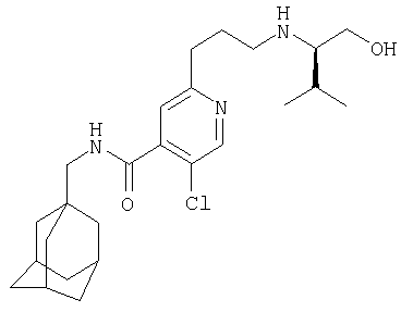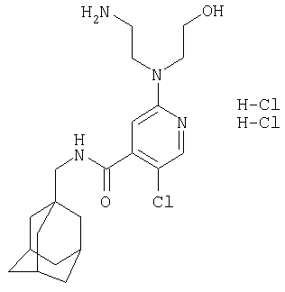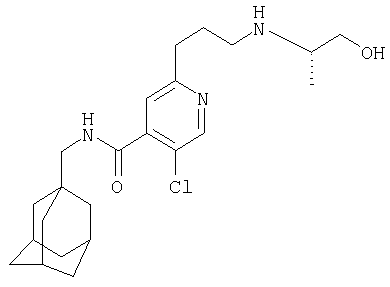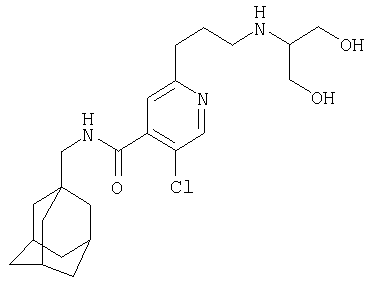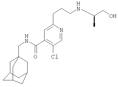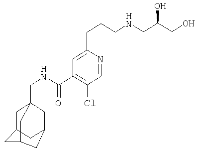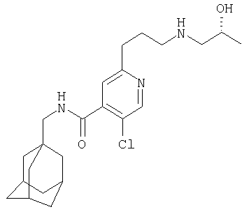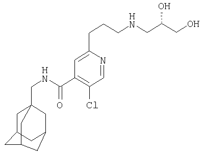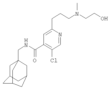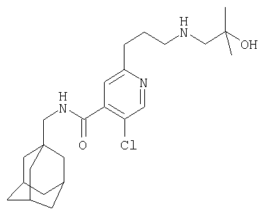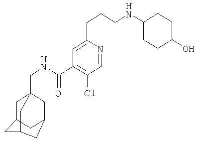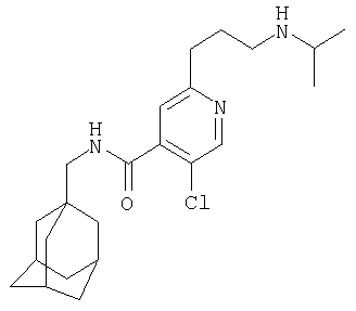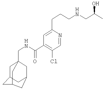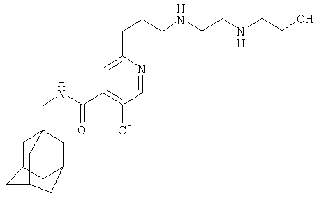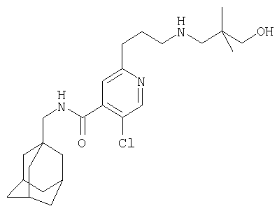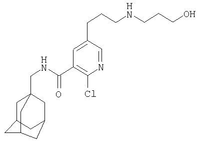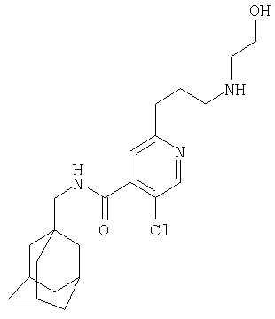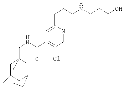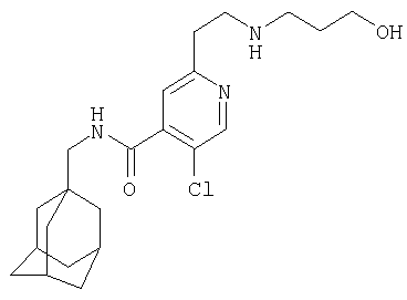 Препаративный путь 1 (1) N-(1-Адамантилметил)-2-бром-5-дихлоризоникотинамид К перемешиваемому раствору диизопропиламина (2,1 мл) в безводном тетрагидрофуране (15 мл) при -5°С прибавляли по каплям раствор н-бутиллития в гексане (2,5 молярный, 4,8 мл) и полученный раствор перемешивали в течение 30 минут и затем охлаждали до -70°С. К охлажденному раствору прибавляли раствор 2-бром-5-хлорпиридина (2,39 г) в безводном тетрагидрофуране (10 мл), поддерживая внутреннюю температуру реакции ниже -65°С. Реакцию поддерживали при -70°С в течение 15 минут и затем по каплям добавляли раствор 1-адамантилметилизоцианата (1,91 г) в безводном тетрагидрофуране (5 мл) (осторожно эзотерма). Смесь перемешивали в течение 10 минут и затем вливали в раствор 1 М водного раствора соляной кислоты (50 мл) и эту смесь экстрагировали в этилацетат (3×25 мл). Объединенные экстракты высушивали над безводным сульфатом магния, фильтровали и концентрировали. Остаток очищали посредством хроматографии на силикагеле, элюируя смесью этилацетат:изогексан (от 1:9 до 1:4 до 1:1) с получением указанного в подзаголовке соединения (2,70 г) в виде белого твердого вещества. 1H-ЯМР (400 МГц, CDCl3) Т.пл.: 193-194°С. (2) трет-Бутил-проп-2-инил[3-(тетрагидро-2Н-пиран-2-илокси)пропил]карбамат Раствор трет-бутил-проп-2-инилкарбамата (1,2 г) в безводном N,N-диметилформамиде (5 мл) обрабатывали 60%-ным гидридом натрия (0,245 г) в одну порцию. После того как выделение водорода прекращалось, добавляли 2-(3-бромпропокси)тетрагидро-2Н-пиран (1,36 г). Реакционную смесь перемешивали под азотом в течение 48 часов, затем разбавляли водой (50 мл) и экстрагировали в этилацетат (3×25 мл). Объединенные экстракты высушивали над безводным сульфатом натрия, фильтровали и концентрировали с получением указанного в подзаголовке соединения (1,61 г) в виде бесцветного масла. 1H-ЯМР (400 МГц, CDCl3) (3) трет-Бутил-3-(4-{[(1-адамантилметил)амино]карбонил}-5-хлорпиридин-2-ил)проп-2-инил[3-(тетрагидро-2Н-пиран-2-илокси)пропил]карбамат Суспензию N-(1-адамантилметил)-2-бром-5-хлоризоникотинамида (Пример 2(1)) (0,43 г) и трет-бутил-проп-2-инил[3-(тетрагидро-2Н-пиран-2-илокси)пропил]карбамата (Пример 2(2)) (0,60 г) в безводном ацетонитриле (6 мл) и триэтиламине (6 мл) продували азотом в течение 5 минут и затем добавляли йодид меди(I) (0,004 г) и бис-трифенилфосфинпалладия дихлорид (0,014 г). Эту смесь перемешивали под азотом в течение 2 часов. Смесь концентрировали и остаток очищали посредством хроматографии на силикагеле, элюируя смесью узогексан:этилацетат (от 19:1 до 7:3) с получением указанного в подзаголовке соединения (0,39 г) в виде желтой смолы. 1H-ЯМР (400 МГц, CDCl3) МС: ХИАД(+ve) 516/518. (4) трет-Бутил-3-(4-{[(1-адамантилметил)амино]карбонил}-5-хлорпиридин-2-ил)пропил[3-(тетрагидро-2Н-пиран-2-илокси)пропил]карбамат Смешанную суспензию трет-бутил-3-(4-{[(1-адамантилметил)амино]-карбонил}-5-хлорпиридин-2-ил)проп-2-инил[3-(тетрагидро-2Н-пиран-2-илокси)-пропил]карбамата (Пример 2(3)) (0,35 г) и 5% родия на углероде (0,020 г) перемешивали при положительном давлении (2 бар, 0,2 МПа) водорода до тех пор, пока наблюдалось поглощение. Смесь фильтровали и концентрировали. Остаток очищали посредством хроматографии на силикагеле, элюируя смесью дихлорметан:ацетон (от 19:1 до 9:1) с получением указанного в подзаголовке соединения (0,24 г) в виде бесцветной смолы. 1Н-ЯМР (300 МГц, CDCl3) МС: ХИАД(+ve) 604/606 (М+1). (5) N-(1-Адамантилметил)-5-хлор-2-{3-[(3-гидроксипропил)амино]пропил}-изоникотинамида дигидрохло