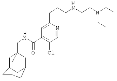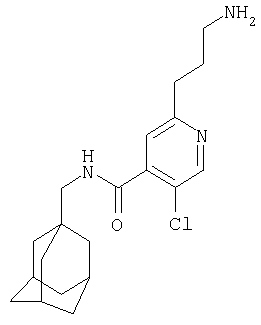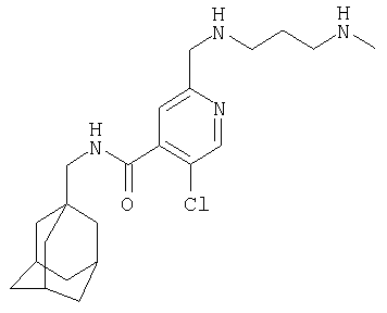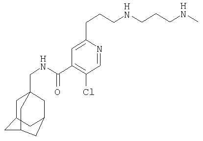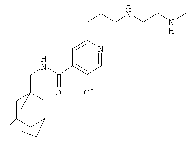 Следуя способу, описанному в Примере 14(4), и используя трет-бутил-2-аминоэтил(метил)карбамат, получали трет-бутил-2-{[3-(4-{[(1-адамантилметил)амино]карбонил}-5-хлорпиридин-2-ил)пропил]амино}этил-(метил)карбамат в виде масла. Это вещество (0,118 г) растворяли в дихлорметане и обрабатывали сухим хлористым водородом в 1,4-диоксане (4 н., 1 мл) и концентрировали через 2 часа с получением депротектированного вещества. Остаток перекристаллизовывали из дихлорметана (3 мл) с получением указанного в заголовке соединения (0,035 г) в виде белого твердого вещества. 1H-ЯМР (300 МГц, CD3OD) MC: ХИАД(+ve) 419, 421 (М+1). Т.пл.: 216-219°С. Пример 22 N-(1-Адамантилметил)-5-хлор-2-(3-{[3-(метиламино)пропил]амино}пропил)изоникотинамида бис(трифторацетат) Следуя способу, описанному в Примере 14(4), и используя трет-бутил-3-аминопропил(метил)карбамат, получали трет-бутил-3-{[3-(4-{[(1-адамантилметил)амино]карбонил}-5-хлорпиридин-2-ил)пропил]амино}пропил-(метил)карбамат в виде масла. Это вещество (0,121 г) растворяли в дихлорметане и обрабатывали сухим хлористым водородом в 1,4-диоксане (4 н., 1 мл) и концентрировали через 2 часа с получением депротектированного вещества. Остаток очищали с помощью препаративной ВЭЖХ с обращенной фазой с получением указанного в заголовке соединения (0,028 г) в виде белого твердого вещества. 1H-ЯМР (400 МГц, СО3OD) МС: ХИАД(+ve) 433, 435 (М+1). Т.пл.: 210-212°С. Пример 23 N-(1-Адамантилметил)-5-хлор-2-[3-({2-[(2-гидроксиэтил)амино]этил}амино)пропил]изоникотинамида дигидрохлорид Следуя способу, описанному в Примере 14(4), и используя трет-бутил-2-аминоэтил(2-гидроксиэтил)карбамат, получали трет-бутил-2-{[3-(4-{[(1-адамантилметил)амино]карбонил}-5-хлорпиридин-2-ил)пропил]амино}этил(2-гидроксиэтил)карбамат в виде масла. Это вещество (0,062 г) растворяли в дихлорметане и обрабатывали сухим хлористым водородом в 1,4-диоксане (4 н., 1 мл) и концентрировали через 2 часа с получением депротектированного вещества. Остаток перекристаллизовывали из дихлорметана (3 мл) с получением указанного в заголовке соединения (0,006 г) в виде белого твердого вещества. 1H-ЯМР (300 МГц, CD3OD) MC: ХИАД(+ve) 449, 451 (М+1). Т.пл.: 231-233°С. Пример 24 N-(1-Адамантилметил)-5-хлор-2-(3-{[2-(диэтиламино)этил]амино}пропил)изоникотинамидадигидрохлорид Следуя способу, описанному в Примере 14(4), и используя N,N-диэтилэтан-1,2-диамин, получали указанное в заголовке соединение N-(1-адамантилметил)-5-хлор-2-(3-{[2-(диэтиламино)этил]амино}пропил)изоникотинамид в виде масла. Очистку осуществляли с помощью препаративной ВЭЖХ с обращенной фазой. Выделенное вещество (0,057 г) растворяли в дихлорметане, обрабатывали раствором хлористого водорода в 1,4-диоксане (1 мл 4 М раствора) и концентрировали с получением указанного в заголовке соединения в виде бесцветного порошка (0,062 г). 1H-ЯМР (400 МГц, CD3OD) MC: ХИАД(+ve) 461, 463 (М+1). Пример 25 N-(1-Адамантилметил)-5-хлор-2-(3-{[2-гидрокси-1-(гидроксиметил)этил]амино}пропил)изоникотинамида дигидрохлорид