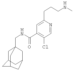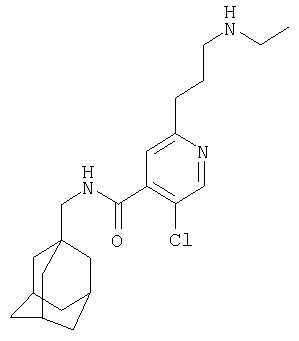 (1) трет-Бутил-3-(4-{[(1-адамантилметил)амино]карбонил}-5-хлорпиридин-2-ил)проп-2-инилкарбамат Суспензию N-(1-адамантилметил)-5-хлор-2-йодизоникотинамида (Пример 2(1)) (0,43 г) и трет-бутил-проп-2-инилкарбамата (0,31 г) в безводном ацетонитриле (5 мл) и триэтиламине (5 мл) продували азотом в течение 5 минут и затем добавляли йодид меди(1) (0,004г) и бис-трифенилфосфинпалладия дихлорид (0,014 г). Смесь перемешивали под азотом в течение 0,75 часа. Смесь концентрировали и остаток очищали посредством хроматографии на силикагеле, элюируя смесью ацетон:дихлорметан (1:19) с получением указанного в подзаголовке соединения (0,34 г) в виде желтой пены. 1H-ЯМР (400 МГц, CDCl3) MC: ХИАД(+ve) 458/460 (M+1). (2) N-(1-Адамантилметил)-2-(3-аминопропил)-5-хлоризоникотинамида гидрохлорид Суспензию трет-бутил-3-(4-{[(1-адамантилметил)амино]карбонил}-5-хлорпиридин-2-ил)проп-2-инилкарбамата (Пример 6(1)) (0,34 г) и 5% родия на углероде перемешивали при положительном давлении (2 бар, 0,2 МПа) водорода до тех пор, пока наблюдалось поглощение. Смесь фильтровали и концентрировали. Остаток растворяли в растворе хлористого водорода в 1,4-диоксане (10 мл 4 М раствора) и оставляли стоять в течение 0,5 часа. Раствор концентрировали и остаток растирали с этилацетатом с получением указанного в заголовке соединения (0,174 г) в виде бежевого порошка. 1H-ЯМР (300 МГц, ДМСО-d6) МС: ХИАД(+ve) 362/364 (М+1). Т.пл.:150°С (разл.). Пример 7 N-(1-Адамантилметил)-5-хлор-2-[3-(этиламино)пропил]изоникотинамида гидрохлорид