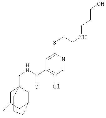 (1) 2-({2-[(трет-Бутоксикарбонил)амино]этил}тио)-5-хлоризоникотиновая кислота К раствору 2,5-дихлоризоникотиновой кислоты (1,82 г) в безводном N,N-диметилформамиде (10 мл) прибавляли 60%-ный гидрид натрия (0,455 г) небольшими порциями. После того как выделение газа прекращалось, добавляли трет-бутил-2-меркаптоэтилкарбамат (1,60 мл). Реакционную смесь затем нагревали при 60°С под азотом в течение 10 часов. Затем дополнительно прибавляли 60% гидрид натрия (0,225 г) и трет-бутил-2-меркаптоэтилкарбамат (1,60 мл) и нагревание продолжали в течение 2 часов. Реакционную смесь концентрировали и остаток суспендировали в 2 М водной соляной кислоте (25 мл) и экстрагировали в этилацетат (3×25 мл). Объединенные экстракты высушивали над безводным сульфатом натрия, фильтровали и концентрировали. Остаток очищали посредством хроматографии на силикагеле, элюируя смесью изогексан:этилацетат:уксусная кислота (6:4:0,1) с получением указанного в подзаголовке соединения (1,0 г) в виде бесцветного порошка. 1H-ЯМР (300 МГц, ДМСО-d6) (2) трет-Бутил-2-[(4-{[(1-адамантилметил)амино]карбонил}-5-хлорпиридин-2-ил)тио]этил[3-(тетрагидро-2Н-пиран-2-илокси)пропил]карбамат К раствору 2-({2-[(трет-бутоксикарбонил)амино]этил}тио)-5-хлоризоникотиновой кислоты (Пример 8(1)) (0,332 г) в безводном N-метил-2-пирролидоне (5 мл) добавляли 60% гидрид натрия (0,084 г). Через 0,5 часа добавляли 2-(3-бромпропокси)тетрагидро-2Н-пиран (0,244 г) и смесь перемешивали под азотом в течение 16 часов. Реакционную смесь разбавляли водой (50 мл) и этилацетатом (50 мл), затем 2 М водным раствором соляной кислоты (50 мл). Смесь экстрагировали в этилацетат (3×25 мл) и объединенные экстракты высушивали над безводным сульфатом натрия, фильтровали и концентрировали. Остаток растворяли в безводном N,N-диметилформамиде (5 мл) и прибавляли 1,1′-карбонилдиимидазол (0,162 г). Через 3 часа смесь обрабатывали 1-адамантилметиламином (0,163 г) в одну порцию и все перемешивали в течение 72 часов. Реакционную смесь разбавляли водой (50 мл) и экстрагировали в этилацетат (3×25 мл); объединенные экстракты высушивали над безводным сульфатом натрия, фильтровали и концентрировали. Остаток очищали посредством хроматографии на силикагеле, элюируя смесью дихлорметан:этилацетат (9:1) с получением указанного в заголовке соединения (0,15 г) в виде бесцветного масла. МС: ХИАД(+ve) 622/624 (М+1). (3) N-(1-Адамантилметил)-5-хлор-2-({2-[(3-гидроксипропил)амино]этил}-тио)изоникотинамида гидрохлорид Указанное в заголовке соединение получали из трет-бутил-2-[(4-{[(1-адамантилметил)амино]карбонил}-5-хлорпиридин-2-ил)тио]этил[3-(тетрагидро-2Н-пиран-2-илокси)пропил]карбамата (Пример 8(2)) (0,15 г) по способу, описанному в Примере 2 (5). Сырую соль гидрохлорид растирали с этилацетатом с получением указанного в заголовке соединения (0,084 г) в виде бесцветной пены. 1H-ЯМР (300 МГц, ДМСО-d6) МС: ХИАД(+ve) 438/440 (М+1). Пример 9 N-(1-Адамантилметил)-5-хлор-2-(3-{[(1R)-2-гидрокси-1-метилэтил]амино}пропил)изоникотинамида дигидрохлорид