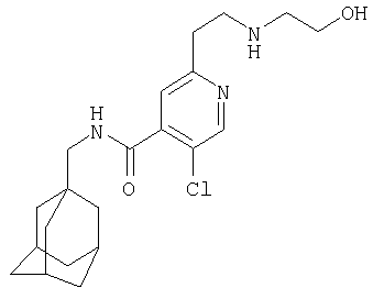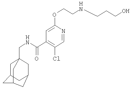 (1) трет-Бутил-(2-{[трет-бутил(диметил)силил]окси}этил)проп-2-ин-1-илкарбамат Указанное в подзаголовке соединение получали из трет-бутил-проп-2-ин-1-илкарбамата (0,8 г), 60% гидрида натрия (0,227 г), (2-бромэтокси)-трет-бутилдиметилсилана (1 мл) и безводного N-метил-2-пирролидинона (4 мл) по способу, описанному в Примере 2(2). Сырой продукт очищали посредством хроматографии на силикагеле, элюируя смесью изогексан:этилацетат (25:1) с получением (0,8 г). 1Н-ЯМР (300 МГц, CDCl3) (2) трет-Бутил-3-(4-{[(1-адамантилметил)амино]карбонил}-5-хлорпиридин-2-ил)проп-2-инил(2-{[трет-бутил(диметил)силил]окси}этил)карбамат Указанное в подзаголовке соединение получали из N-(1-адамантилметил)-2-бром-5-хлоризоникотинамида (Пример 2(1)) (0,37 г), трет-бутил-(2-{[трет-бутил(диметил)силил]окси}этил)проп-2-ин-1-илкарбамата (Пример 11(1)) (0,54 г), йодида меди(1) (0,004 г), бис-трифенилфосфинпалладия дихлорида (0,014 г), триэтиламина (6 мл) и безводного ацетонитрила (6 мл) по способу, описанному в Примере 2(3). Сырой продукт очищали посредством хроматографии на силикагеле, элюируя смесью изогексан:этилацетат (от 8:1 до 4:1) с получением указанного в подзаголовке соединения (0,28 г) в виде желтой смолы. 1H-ЯМР (300 МГц, CDCl3) (3)N-(1-Адамантилметил)-5-хлор-2-{3-[(2-гидроксиэтил)амино]пропил}-изоникотинамида гидрохлорид Указанное в заголовке соединение получали из трет-бутил-3-(4-{[(1-адамантилметил)амино]карбонил}-5-хлорпиридин-2-ил)проп-2-инил(2-{[трет-бутил(диметил)силил]окси}этил)карбамата (Пример 11(2)) (0,28 г) по способу, описанному в Примере 6(2). Сырую соль гидрохлорид растирали с этилацетатом с получением указанного в заголовке соединения (0,176 г) в виде бежевого порошка. 1Н-ЯМР (300 МГц, ДМСО-d6) МС: ХИАД(+ve) 406/408 (М+1). Т.пл.: 204-205°С (разл.). Пример 12 N-(1-Адамантилметил)-5-хлор-2-{2-[(3-гидроксипропил)амино]этокси}изоникотинамид, гидрохлорид (1) N-(1-Адамантилметил)-5-хлор-2-(2-гидроксиэтокси)изоникотинамид Гидрид натрия (60%, 0,080 г) прибавляли к этиленгликолю (3 мл) и полученную суспензию перемешивали в атмосфере азота в течение 30 минут. К этой смеси прибавляли раствор N-(1-адамантилметил)-2-бром-5-хлоризоникотинамида (Пример 1(2)) (0,192 г) в безводном N-метил-2-пирролидиноне (1 мл). Мешалку удаляли и полученный раствор нагревали в микроволновой печи MARS в течение 15 минут (300 Вт, 150°С). Смесь охлаждали и вливали в воду (50 мл) и экстрагировали в этилацетат (3×10 мл). Объединенные органические экстракты промывали рассолом (2×10 мл), высушивали над безводным сульфатом магния, фильтровали и концентрировали. Остаток очищали посредством хроматографии на силикагеле, элюируя смесью этилацетат:изогексан (1:1) с получением указанного в подзаголовке соединения (0,092 г) в виде белого твердого вещества. 1H-ЯМР (300 МГц, CDCl3) MC: ХИАД(+ve) 364/366 (М+1). Т.пл.: 154-155°С. (2) N-(1-Адамантилметил)-5-хлор-2-{2-[(3-гидроксипропил)амино]этокси}изоникотинамид, гидрохлорид К перемешиваемому раствору N-(1-адамантилметил)-5-хлор-2-(2-гидроксиэтокси)изоникотинамида (Пример 12(1)) (0,10 г) в сухом дихлорметане (5 мл) прибавляли реагент Десс-Мартина (0,212 г) и полученную суспензию перемешивали при комнатной температуре в течение 30 минут. Реакционную смесь вливали в смесь насыщенного раствора бикарбоната натрия, содержащего тиосульфат натрия (10% мас./об., 20 мл), и смесь экстрагировали в этилацетат (3×25 мл). Объединенные экстракты высушивали над безводным сульфатом магния, фильтровали и концентрировали. Сырой альдегид растворяли в метаноле (2 мл) и прибавляли 3-ам